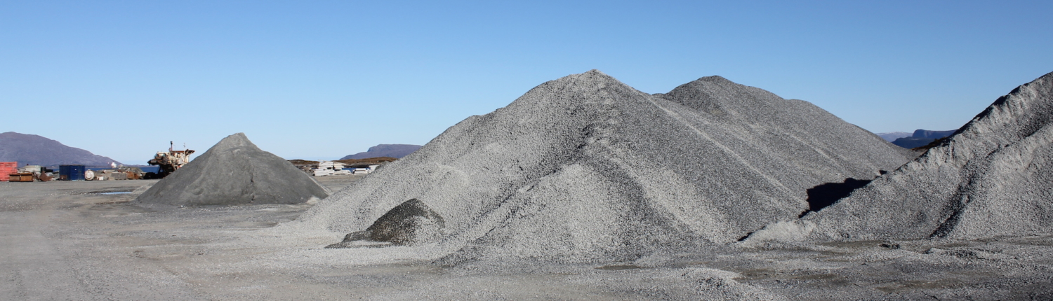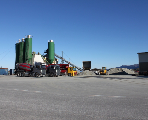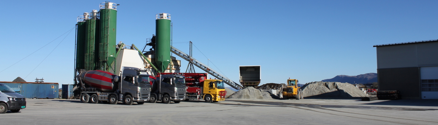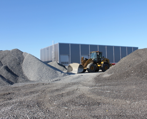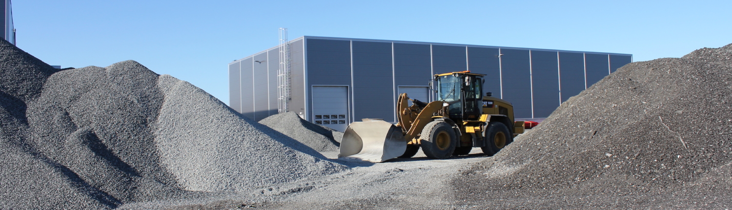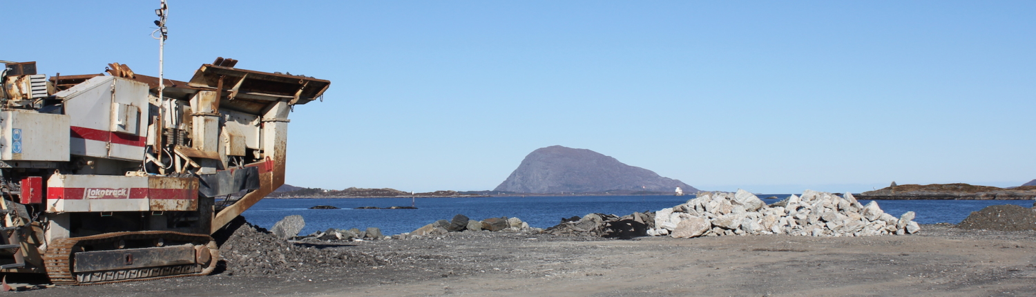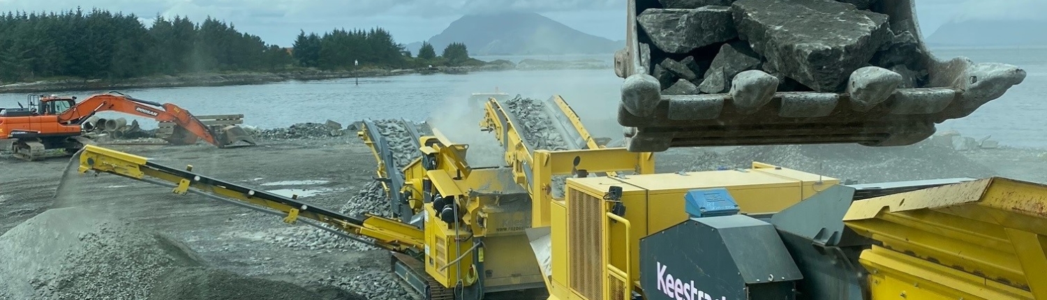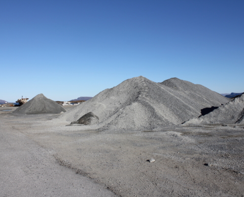 Vi produserer eigne massar som grus, singel, pukk, sand og sortert jord. All overskuddstein som vi skyter fra ulike prosjekt blir kjørt ned hit og knust opp med eit knuseverk, videre sortert i eit sorteringsverk.